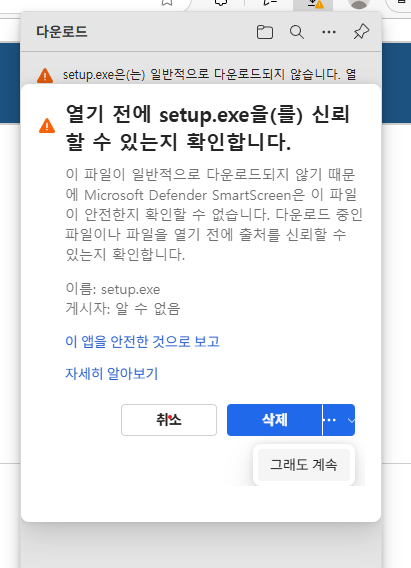 이때 웹브라우저(Edge,크롬,웨일 등)에 다운로드 창에서 적절한 옵션 "유지" 으로 다운로드 가능합니다.